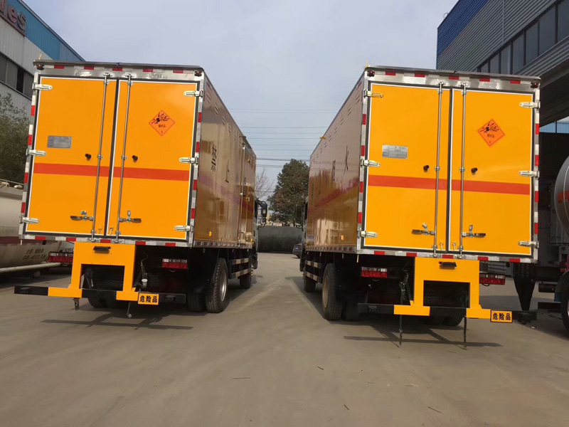 廂體頂部封閉,不可開啟。該車為危險(xiǎn)品運(yùn)輸車。隨底盤選裝駕駛室.前面罩,前組合燈具.運(yùn)輸品名:黑火藥,壓縮黑火藥,炸藥,雷管,類項(xiàng)號(hào):1.1B,1.1D,1.1G,1.2G,1.3G.廂體側(cè)面板選裝開百葉窗,選裝不帶側(cè)門,側(cè)門型式及位置;廂體顏色可變化,文字噴涂位置可變化.側(cè)面及后下部防護(hù)裝置材料為Q235,與車架采用焊接連接.后下部防護(hù)裝置斷面尺寸(mm):120×50,離地高度:520mm。選裝液壓升降尾板,選裝液壓尾板時(shí)收起狀態(tài)的水平長度為300mm,僅采用排氣管前置、子午胎,限速裝置,**制動(dòng)裝置和前盤制動(dòng)器的底盤;限速80km/h.安裝具有衛(wèi)星定位功能的行駛記錄儀; ABS系統(tǒng)生產(chǎn)廠家,型號(hào) :焦作博瑞克**技術(shù)有限公司,J ABS.安裝具有衛(wèi)星定位功能的行駛記錄儀.僅采用10.00R20 18PR,295/80R22.5 16/18PR輪胎。